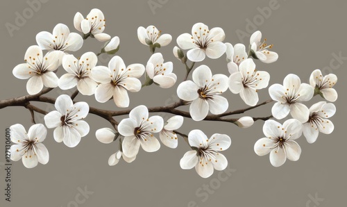 Delicate white cherry blossom branch against a muted gray background, symbolizing spring