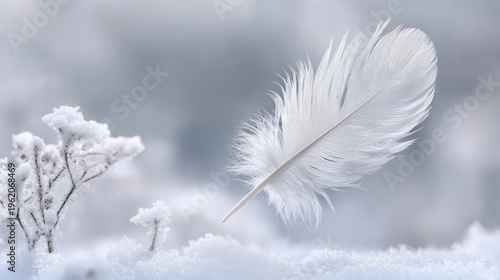 Delicate white feather gently drifting down through soft, misty clouds in a serene sky