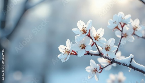 Delicate white flowers on snow-covered branches, white flowers, crown