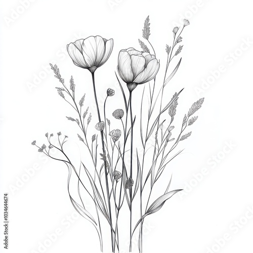 Delicate Wildflower Sketch: A minimalist black and white illustration of wildflowers, capturing the beauty of nature's simplicity.