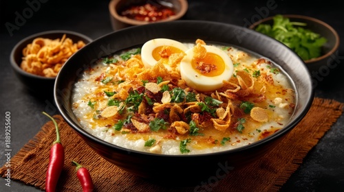 Delicious and Flavorful Rice Porridge with Egg, Herbs, and Crispy Toppings Served in a Black Bowl on a Dark Background