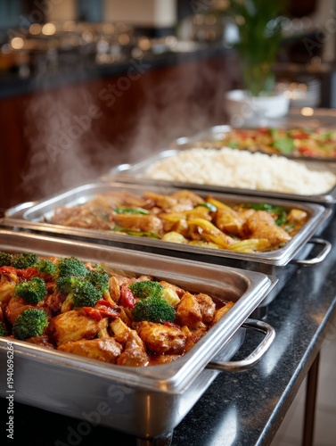Delicious Asian buffet with steaming dishes in restaurant