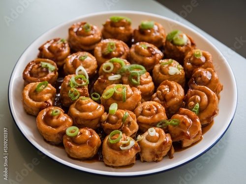 Delicious Asian-style rolls topped with savory sauce and green onions, served on a white plate.