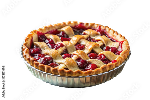 Delicious baked cherry pie displayed in a metallic pie pan against a White background