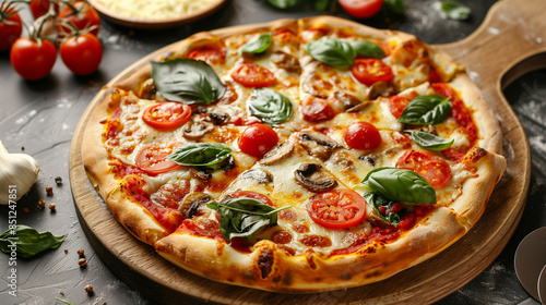 Delicious baked pizza with cheese, tomatoes, basil, mushrooms. Italian Cuisine. Restaurant, kitchen. Vegetarian pizza.