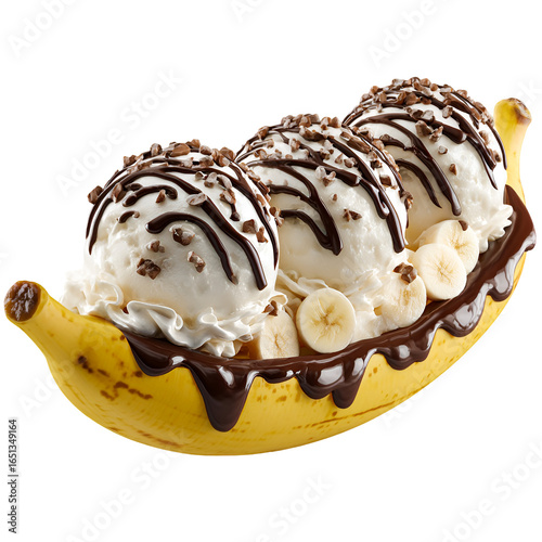 Delicious banana split ice cream dessert with chocolate syrup and banana slices isolated on transparent background