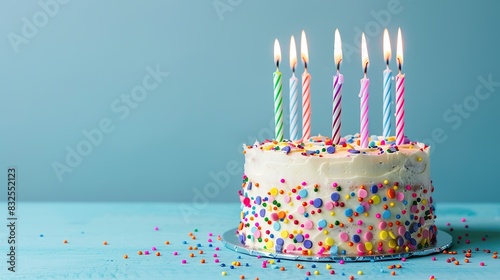 Delicious birthday cake with candles on a light blue background with copy space to add text. Template design and banner.