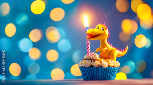Delicious birthday cupcake with a glowing candle, set against a background of blurred festive lights .