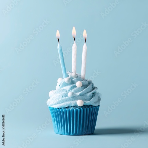 Delicious Blue Birthday Cupcake with Three Lit Candles