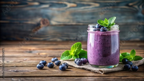 Delicious Blueberry Smoothie in Glass Jar with Fresh Mint on Rustic Wooden Table