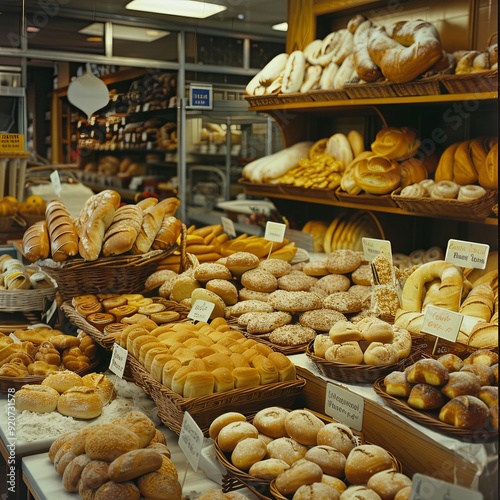 Delicious breads in a bakery, different types of breads on the shelves of the bakery