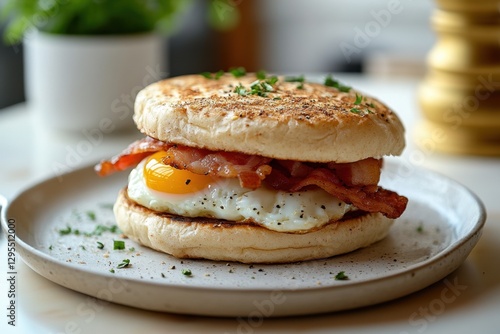 Delicious breakfast sandwich with fried egg and crispy bacon on a plate in a bright setting culinary delight