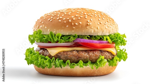 Delicious Burger with Sesame Seed Bun, Lettuce, Tomato, Cheese, and Onion Rings