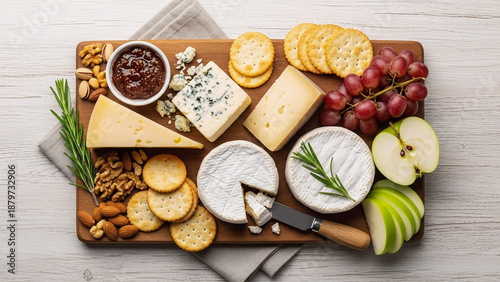 Delicious cheese board with crackers, fruit, and nuts for snacking