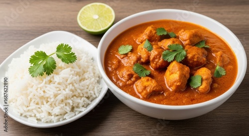Delicious Chicken Tikka Masala with Basmati Rice and Lime Wedge