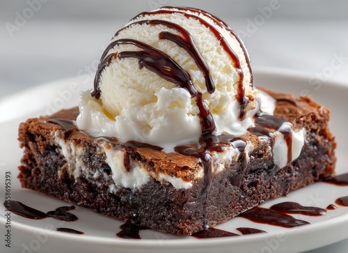 Delicious Chocolate Brownie with Ice Cream and Whipped Cream Topped with Chocolate Sauce on a White Plate