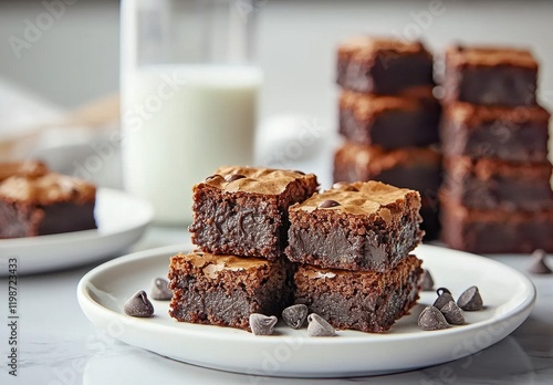 Delicious Chocolate Brownies Stacked on a Plate with Milk and Chocolate Chips in Background