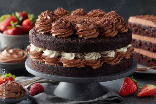 Delicious chocolate cake with creamy frosting and fresh strawberries on a dark table
