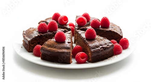 Delicious chocolate cake with fresh raspberries isolated on white background