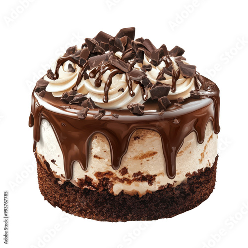 Delicious chocolate cheesecake topped with creamy frosting and chocolate shavings, perfect for any dessert lover.