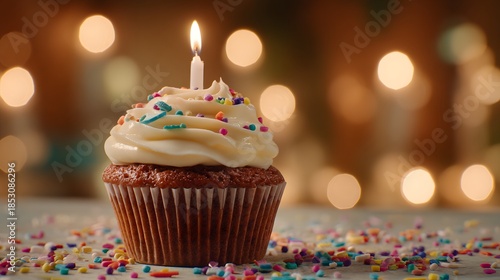 Delicious Chocolate Cupcake with Sprinkles and a Lit Candle.