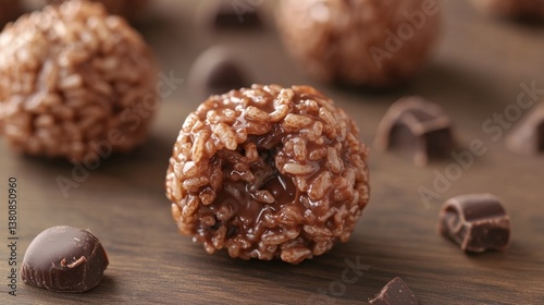 Delicious chocolate puffed rice bars on wooden table, closeup