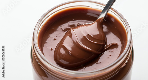 Delicious chocolate spread with a spoon in a glass jar, close-up view