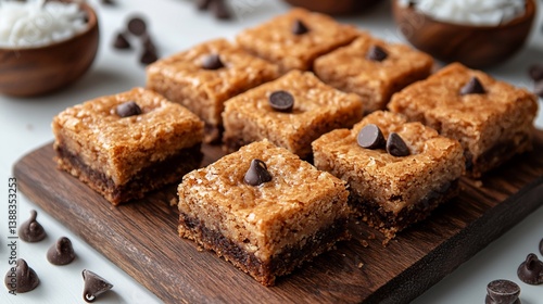Delicious coconut chocolate chip dessert bars on wooden board.