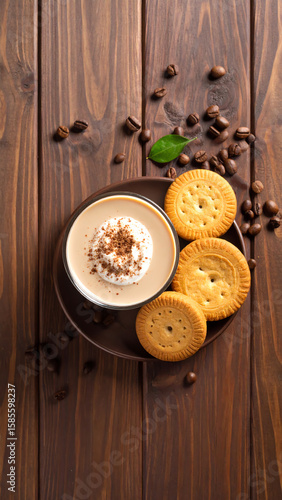 Delicious cookies served with creamy coffee dessert on rustic wooden table, perfect for a cozy snack.