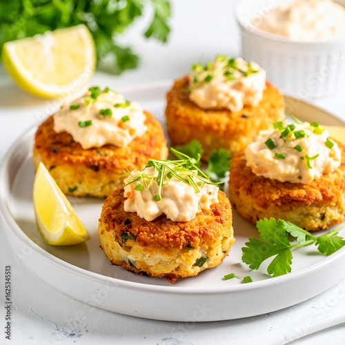 Delicious crab cakes plated with tangy sauce and lemon garnish, a savory dish on white background