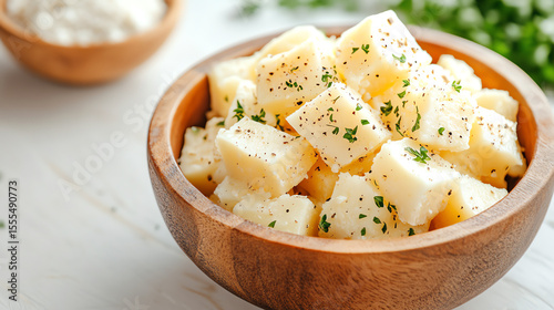 Delicious, creamy cheese cubes sprinkled with herbs, perfect for snacking or adding to salads. Fresh and inviting presentation.