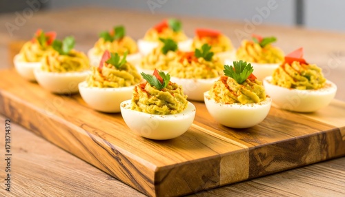 Delicious deviled eggs, garnished and arranged on a wooden board