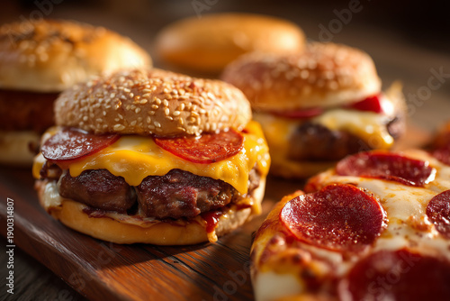 Delicious Fast Food Spread: Cheeseburgers and Pepperoni Pizza on Wooden Surface