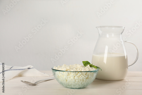 Delicious fresh cottage cheese with basil and milk on white wooden table. Space for text