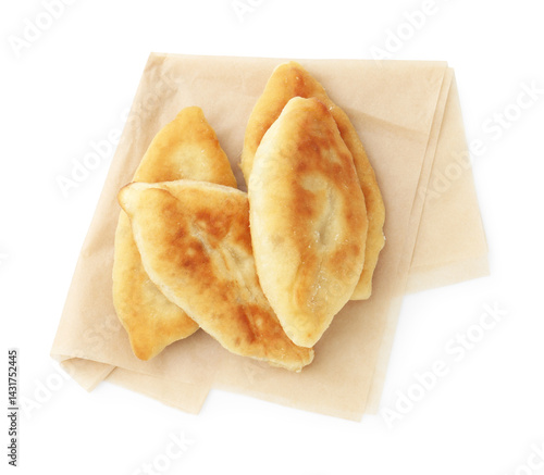 Delicious fried pyrizhky (stuffed pies) isolated on white, top view