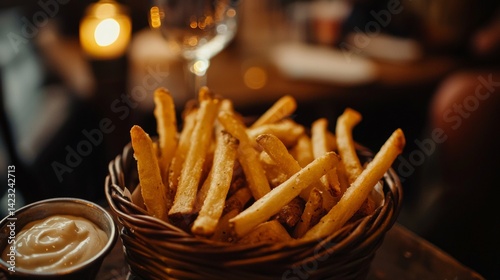 Delicious golden fries served with creamy dip in a cozy restaurant setting during evening hours