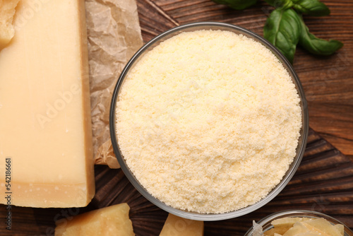 Delicious grated parmesan cheese in bowl on wooden table, flat lay