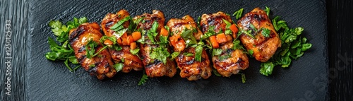 Delicious grilled chicken thighs garnished with fresh herbs.