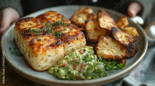 Delicious grilled fish with crispy crackers and vibrant guacamole. A sophisticated and appetizing meal presented on a rustic plate.