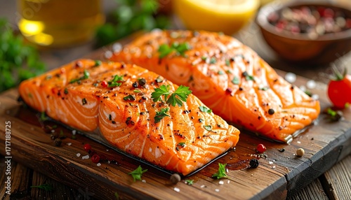 Delicious Grilled Salmon Fillets on Wooden Board with Herbs.