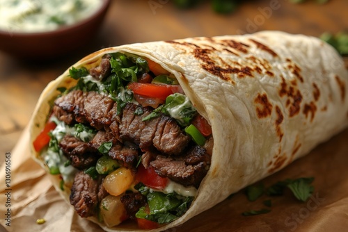 Delicious grilled steak burrito with fresh vegetables and sauce