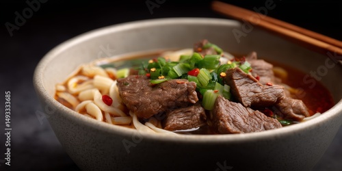 Delicious hand-pulled lanzhou beef noodles in a bowl with fresh garnishes