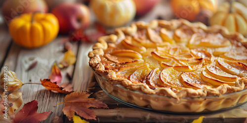 Delicious homemade apple pie adorned with autumn leaves and pumpkins on a rustic wooden table