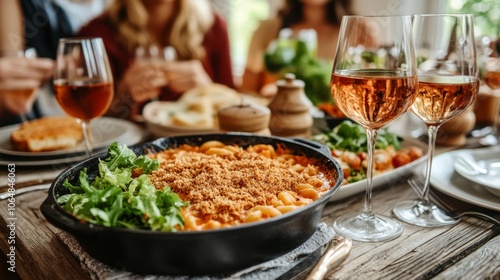 Delicious Homemade Pasta Bake with Rose Wine and Salad for Dinner Party