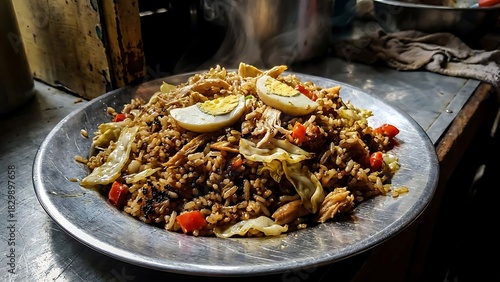 Delicious hot chicken fried rice with eggs and vegetables served on a metal plate