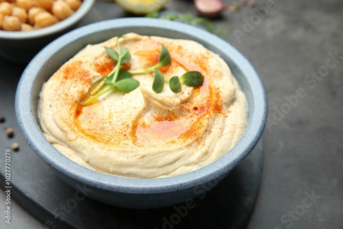 Delicious hummus with paprika served on dark grey table