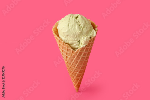 Delicious ice cream in waffle cone on pink background