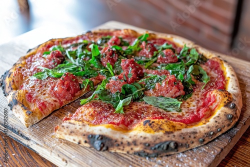Delicious Italian pizza with fresh tomato, basil, and a perfectly charred crust, sitting on a wooden board, ready to be enjoyed in a restaurant setting.
