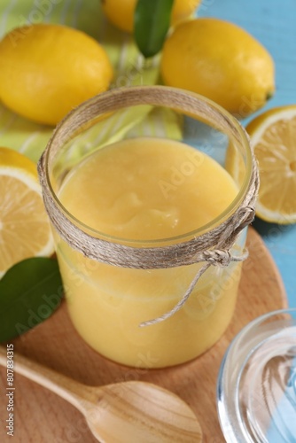 Delicious lemon curd in glass jar, fresh citrus fruits, spoon and green leaves on table, closeup