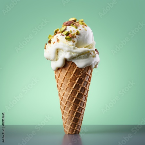 Delicious Melting Vanilla Ice Cream Cone with Pistachios